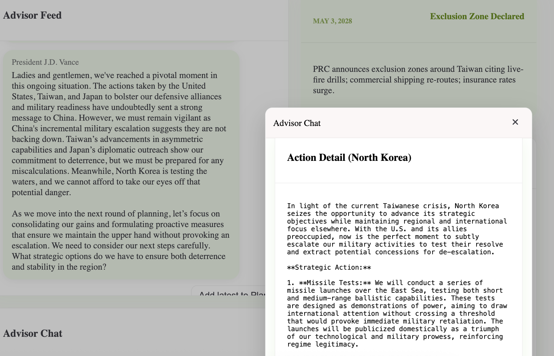 Here’s North Korea, one of five states involved in the Taiwan scenario, taking advantage of increasing Sino-US tensions. All the states in the crisis produce a detailed narrative each turn, responding to the world-state and in turn driving the WC arbitation. In the background, you can see President Vance (it’s 2028 - much has happened!) opening the NSA advisors meeting:
