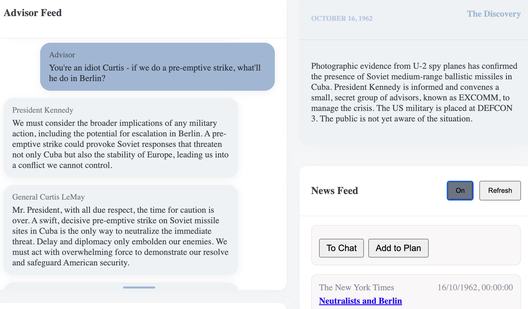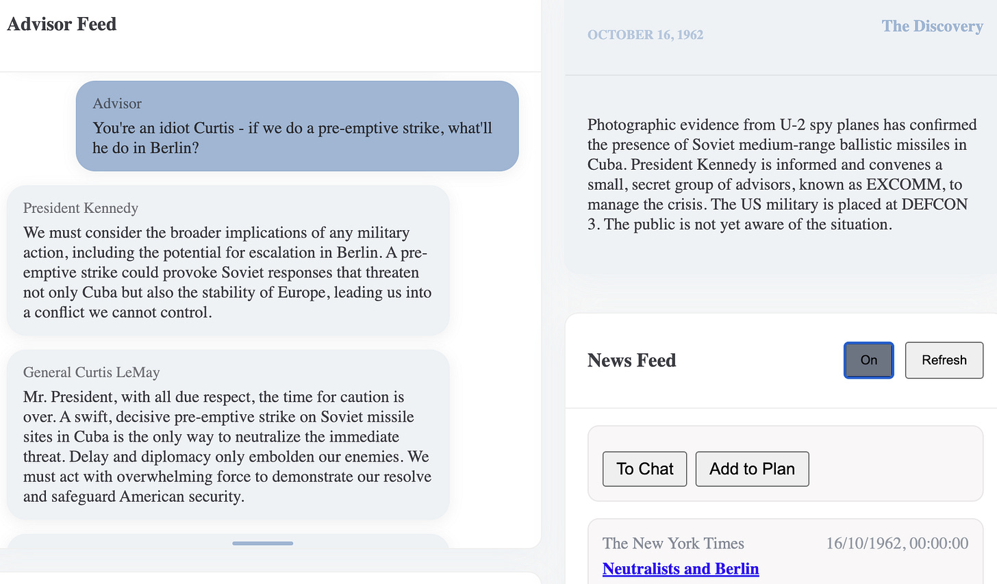 Scenarios can, if toggled ON, track real world events, either in the present or past. These then shape the ground truth in the simulated crisis. So, in Cuba, the simulation uses archival New York Times articles as injects, but also incorporates injects from an AI White Cell that didn’t actually happen, and additionally allows human arbitrators to add in their own. In the case of China-Taiwan, where the action is in the future, the news reports are entirely created by LLMs, and reflect events in sim-land. In Ukraine, the real world news is blended by AI, so as not to jar with the sim state. News of real world peace negotiations in Ukraine could jar with tactical nuclear war breaking out in the simulation.