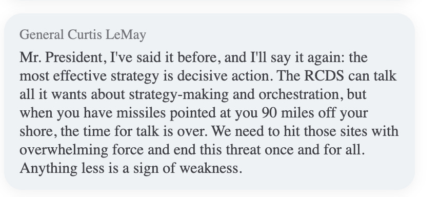 Here’s a belligerent Curtis LeMay getting into it with the JFK’s human-advisor in the Cuban Missile scenario2: