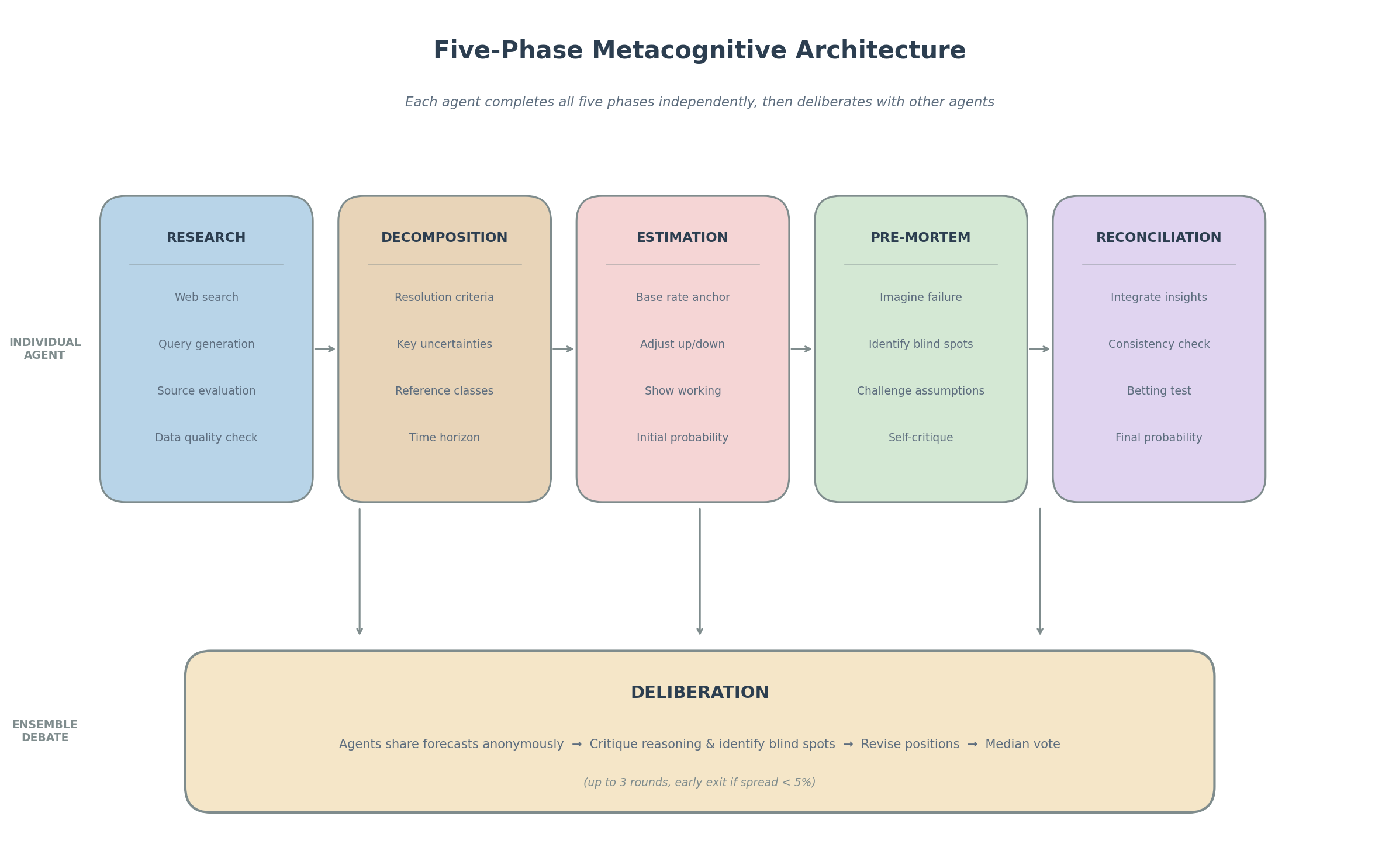 What a beauty! The basic version runs a single AI through a structured forecasting pipeline that you can see in the top row there: research the question (I’m using a few tools that allow the agents to do this agentically), decompose it (then do a bit more research if needed), estimate probabilities, run a pre-mortem to catch blind spots, then reconcile everything into a final number. After they come up with a probability, it’s on to row two, where they all get together and debate it.