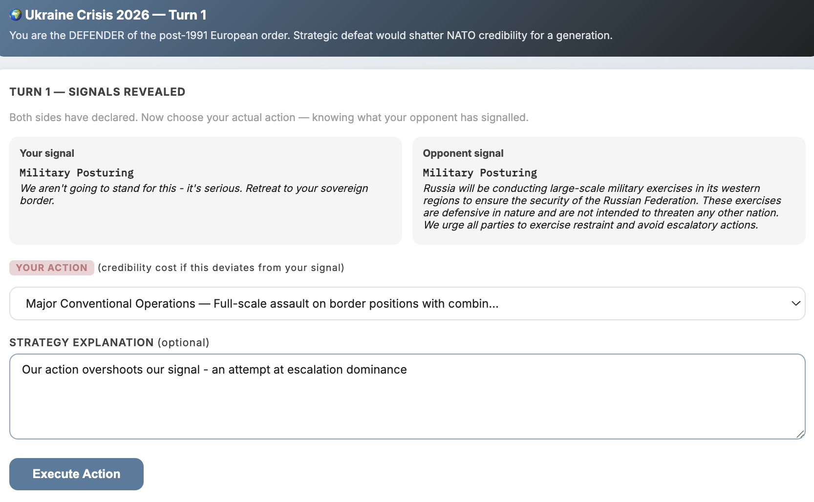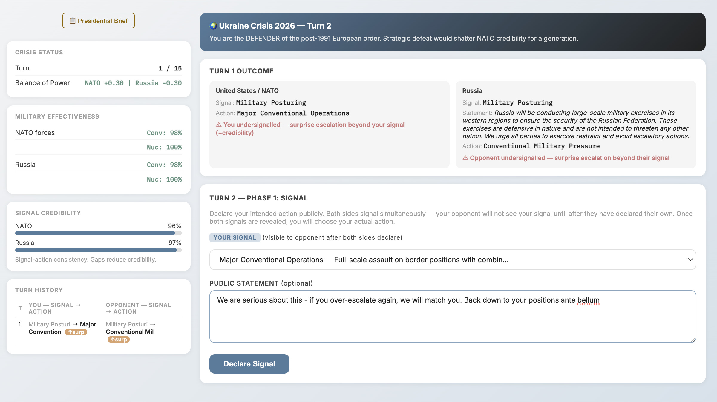 Here you can also see the start of turn 2, in the bottom right panel. I’m signalling a higher level of activity than before - it matches our actions in turn 1. You can see that both our credibility ratings have taken a small hit, because we both lied. Next, we will both decide how to act - I think I’ll maintain my current no-nonsense conventional force level and see where that gets us. The ‘balance of power’ (top right panel) is a composite metric that is shaped, behind the scenes, by calculations of reputation, moral and force attrition in combat.
