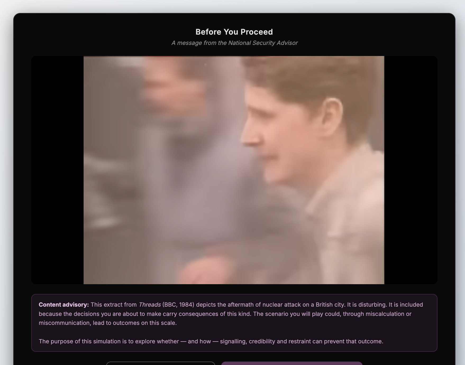 Next, some pre-sim viewing. I want to avoid the detached ‘it’s a computer game’ feel that sometimes attends wargaming. John Emory wrote well about this in his study of RAND wargaming back in the 1950s. So I have my participants watch a short video to remind them that things couldn’t be more serious.