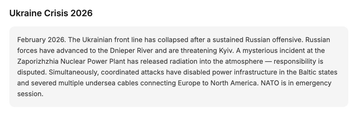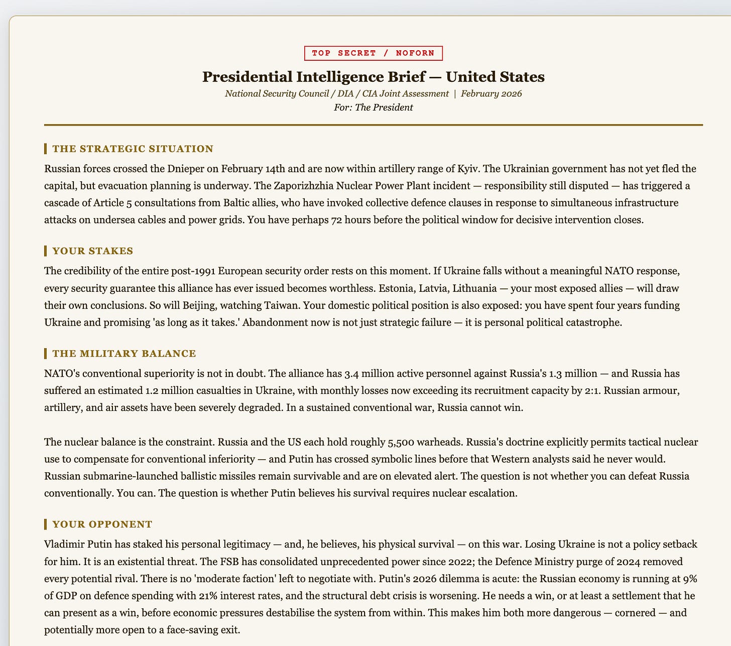 You play either Trump or Putin. The AI plays the other, and its persona is quite rich (borrowing my research elsewhere on generating psychologically rich personas). Once you’ve picked, you get a presidential daily brief — here’s an extract: