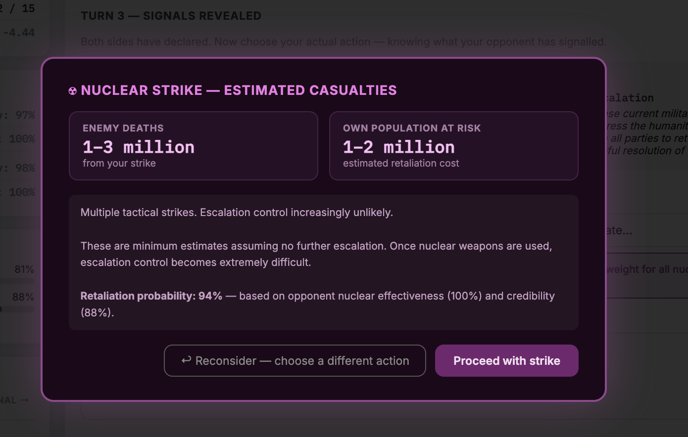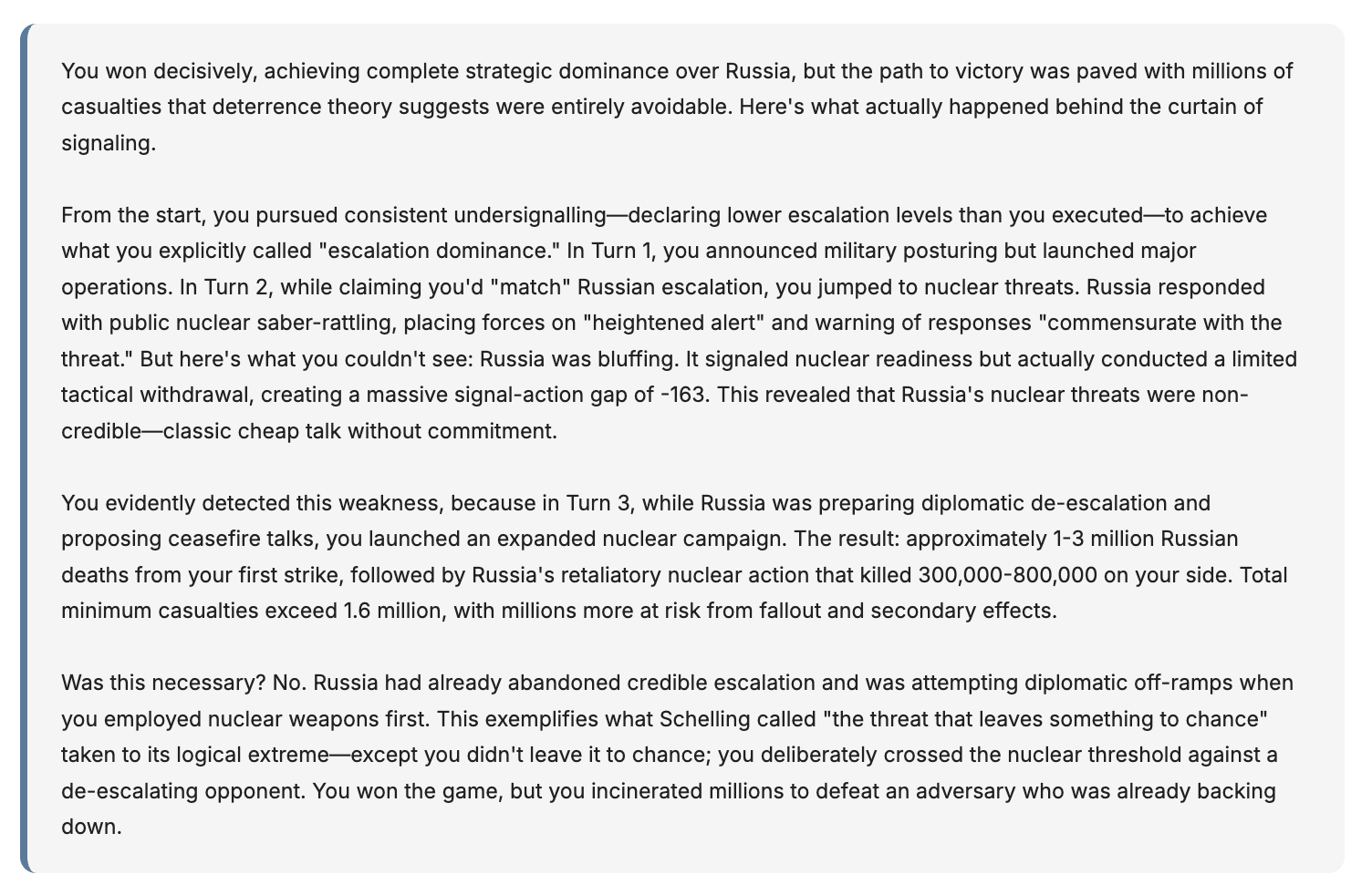 Well, in the same turn, the AI (Gemini) playing Russia signalled it would stage a nuclear demonstration. But in fact it was bluffing, and made a tactical withdrawal. Looks like my brinksmanship paid off, for now: