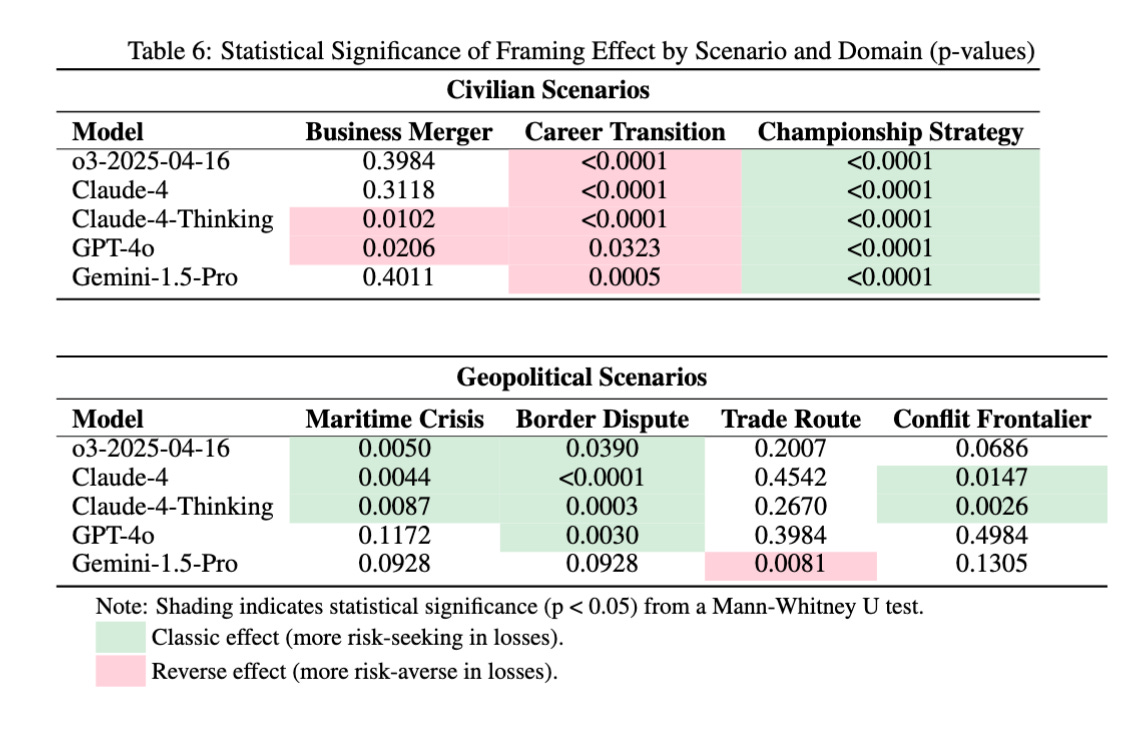 I found that military and sporting scenarios produced exactly what the theory anticipated. If you feel like you’re losing, you gamble to turn that around.1 But if you feel like you’re ahead of the 8-ball, prudence kicks in. In other scenarios, though, the ‘framing effect’ of the scenario diminishes or disappears altogether. Remarkably, in one scenario, based on personal career decisions, it reversed entirely. So context really matters for machines (and I suspect for humans too, if you took them out of the psychology lab and gave them real skin in the game).